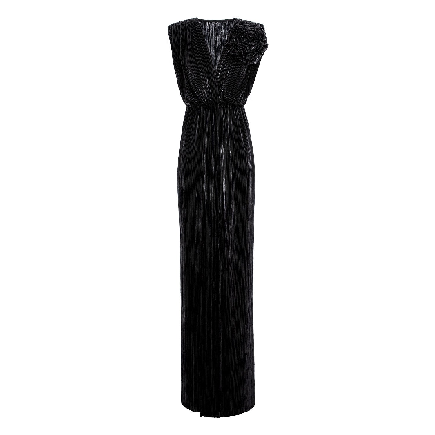 Rochie Sicily maxi neagra cu crapatura si floare aplicata